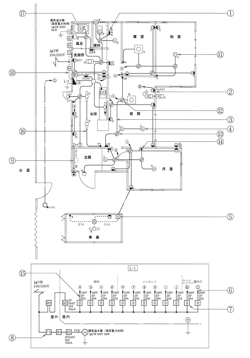 図は、木造1階建住宅の配線図である。この図に関する次の各問いには4通りの答え(イ、ロ、ハ、ニ)が書いてある。それぞれの問いに対して、答えを1つ選びなさい。