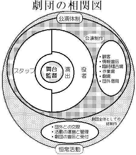 - 劇団という形で公演を行うと、自ずと劇団名が個性化して浸透していきます。それは公演内容の性質だけではなく,劇団という集団そのものが持つ特徴や主宰者や代表者や個々の団員のタイプなど様々な要素が含まれます。そのうえで活動を通じて他の劇団や関連集団などとの交流が生まれます。また,自分達の劇団内では収まらないこと、例えば情報収集や合同練習,公演に必要な借用物や人手の確保などが発生します。自分達に知識や技術や情報がなくって困る事と同様に、他の劇団にも困る事が有りますのでお互いの助け合いが必要となります。