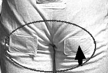 臀部の外側(おしりの横)で脚の付け根の辺りに肉が薄くて骨の有るのが解る箇所があります。そこから3〜5cm位上の所に押すと特別痛みを感じる所が有ります。そこから前に向かって貼る様にして下さい。ガードルなどで余り締め付けのきつ過ぎる衣類は,低温火傷を起こす可能性があるので御注意下さい。 |