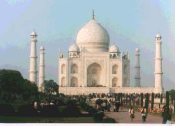 ホテル クラークスシラーズ 昼食後、フロントで両替する。一万円=2800ルピー。全部お札だから、重ねると1cmくらいの厚さになる。マハラジャになった気分が味わえる。インドで買い物をする時はやはりこうでなければいけない。ホテルなど主な所ではほとんど日本円が使えるが、やはり円だと割高になる。1ルピーが日本円で約4円というレート計算は確かであるが、いちいち日本円に直してその感覚で買い物をしてはいけない。それはつまり、いちいち外国語を日本語に訳してから理解するのと同じである。それだと大きな間違いをおかすことになる。為替レートというのは細かい具体的な物価を比較して決められたものではないからだ。例えば、インドの新聞は一部1.5ルピーで買えるのだ。日本円にすると6円だ。6円で新聞が買える。しかし逆にコンピュータやカメラなどのハイテク製品は日本の倍くらいの値段である。つまりは、インドで作られたものなら日本の物価の10分の1から20分の1くらいの値段と考えて良い。それを知らずに日本円で買い物をすると現地の人はちゃんと日本の物価に合った値段を要求するのだ。だから、現地通貨に両替して現地の値段で買い物をしなければならないのだ。両替したいと言った時ラケシュはどうもいい顔をしなかったわけが次第にわかってきた。ラケシュは自分がつき合いのある店でできるだけ高い値段で私に買い物をさせようとしているのだ。日本円がそのまま使えるから両替しなくてもいいと言い張るのだ。自分で両替してみてそれがよくわかった。インド通貨に両替するとたちまち大金持ちになれるのだ。ようやくガイドのやり口もわかってきて、彼もインド人であることを改めて認識したのである。単純に彼の言うことを信じるわけにはいかないのだ。それがインド人なのだから。 いよいよ タージマハル かの有名な世界遺産のタージマハル。駐車場から歩くとかなり遠い。そこから電気自動車が運行している。なぜ電気自動車かというと、ガソリン車の排気ガスが酸性雨を降らせて大理石を溶かしてしまうからだそうだ。タージマハルは全て大理石でできているのだ。電気自動車には2、30人乗れる。出発を待つ間、例によって物売りが激しく寄ってくる。Tシャツが一枚150ルピーだという。それが違うところで15ドルで売っていた。つまりはそういうことなのだ。外国人(日本人)がインドの物価を高くしているのだ。ここでは小さい子もみな日本語をしゃべる。といっても「いくら?」とか「あとで」とかオウムのように同じ言葉を繰り返す。まさしくオウムだ。これは数限りない日本人が彼らに繰り返し教えた言葉なのだ。「あとで」というのは日本人がしつこい物売りから逃げるためについ口にしてしまう言葉だ。「あとで」といってもそれは日本人のその場しのぎの方便に過ぎない。ところが彼らは帰りにちゃんと覚えていてまた寄ってくるのだ。「あとでと言っただろ」という顔をして寄ってくるのだ。それにしても日本人が多い。私のような「たこつぼ人間」までもが来るようになったのだから、無理もないかと思う。インドまで来て日本人と会いたくない。話もしたくない。そう思って意識的に日本人を避けている自分がいる。 中へ入る。切符はなぜか、二カ所で切る。外の入り口でまず半分に切り、中の入り口でさらにちょびっと切られる。これは何のおまじないなのだろうか。ラケシュはついてこない。入場料が高いせいではない。かれはヒンドゥー教徒だから、このイスラム帝国の遺物には入れないのだ。今でもイスラム教徒の兵が入り口で一人一人チェックし警戒している。ヒンドゥー教の過激派がここを爆破する計画もあるらしい。タージマハルはシャージャハン帝が愛した妃の名前だ。つまり、ここはその妃の巨大な墓なのだ。ピラミッドも巨大な墓だが、やはり世界で最も美しい墓といえばここだろう。墓に金をかけるというのはどういう心理なのか今ではもう想像しがたい。一方、ヒンドゥー教は墓を持たず、ガンジス川に同化することを願っている。 タージマハルはやはりすばらしい。あの造形。完成までに22年かかっている。入り口の巨大な門の上に丸い宝珠のようなものが22個並んでいる。職人は総勢2万人が動員された。完成後、その2万人は手を切り落とされたという。タージマハルのコピーを造らせないためだという。 建物に上がるのに靴を預けなければならない。1ルピー取られる。まず、タージマハルの周囲をぐるっと一周してみる。裏側に回ってみるとすぐ下に大きなヤムナー川が流れている。その対岸に数百頭という数のラクダが集合している。ラクダの売買が行われているのだろうか。それとも何かの催しだろうか。持っていったカメラの望遠レンズでのぞいて見ていると、隣にいたインド人のおっさんが見せろという。そんなに強引ではないのだが、当然のごとく要求する。こういうところが日本人と違って面白い。そういえばバスの中でも