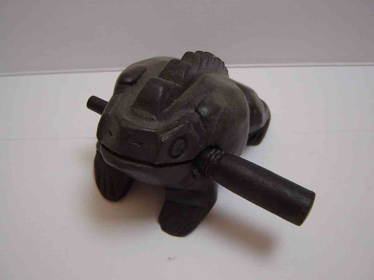 | コロコロカエル楽器 背中のギザギザ部分を口にくわえている棒で鳴らす楽器。 カエルの鳴き声に似ているような似ていないような。 木魚に似ている。 |