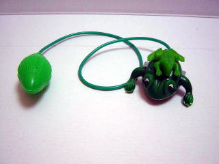 | ご存じ空気跳びカエル 昔ものすごく感動したおもちゃ。 今のは安くてあまりよく跳ばない。しかもご丁寧にもう一匹背中に乗っている。これはいらない。 |
