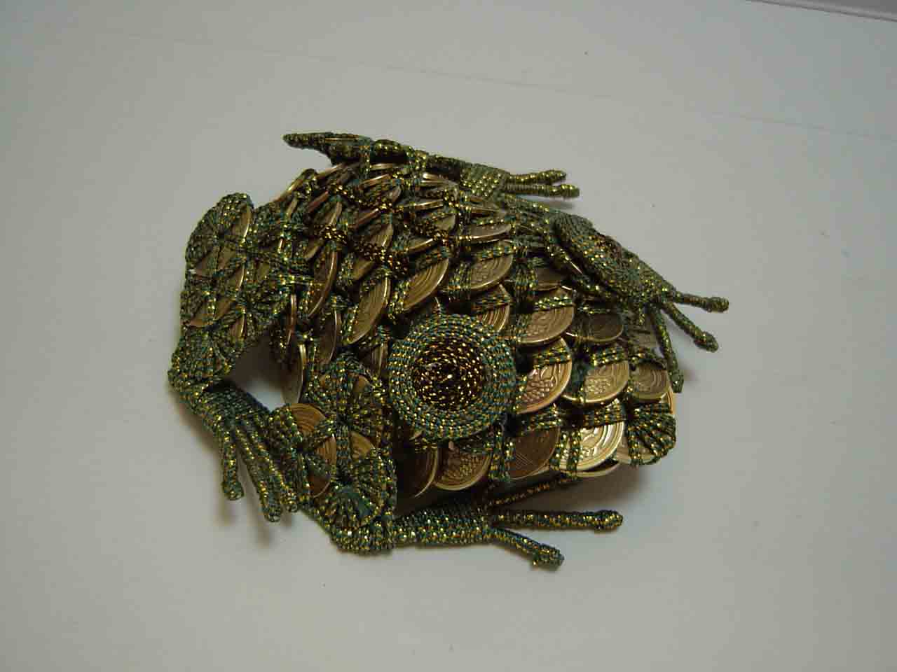 | 五円玉カエル 五円玉をヒモで結んで作ったカエル。通信講座で作り方とかヒモがついてくる親父が暇にまかせて作った。マッチ棒で作る五重塔の類か。 |