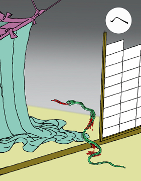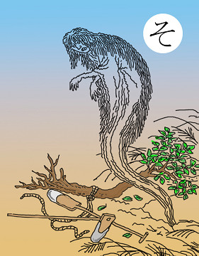 〈読み札〉 「蛇の生殺し 手負い蛇となって 仇(あだ)をなす」 〈妖怪名〉 「手負い蛇」(ておいへび) 〈解説〉 動物には執念深い動物とそうでない動物とがいるようです。猫などは執念深い動物の代表で、車で猫をひき殺したりすると、猫の霊に取り憑かれて事故に遭ったりする話がまことしやかに伝えられています。蛇も同じく執念深い動物の一つで、蛇の生殺しといいますか、殺しきれなかった蛇は手負い蛇と言って、夜、復讐にやってきます。だから、殺すときは完全に殺さなければいけません。また、変な情けをかけてもいけません。かわいそうだなどと考えてお墓をつくってあげたりすると、かえって取り憑かれます。気をつけましょう。 |