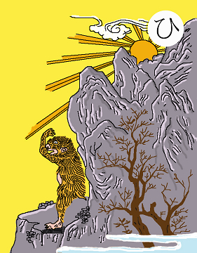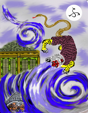 〈読み札〉 「不吉の前兆鵺の声」 〈妖怪名〉 「鵺(ぬえ)」 〈解説〉 絵のとおり、頭は猿、体は狸、脚は虎、尻尾は蛇というキメラ妖怪で、源頼政が退治したと言われている。もともとは夜の鳥と書いて鵺であり、声の妖怪である。不気味な声で鳴く鳥である。これが鳴くと不吉なことが起こると言い伝えられた。正体が見えないからこそ恐ろしいのであり、このようなキメラ妖怪であれ何であれ、正体を現したらもうそれで怖くはないのである。因みに「鵺のような奴」というのは、つかみどころのない、得たいの知れない奴のことを言う。 |
