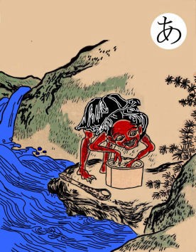 読み札 小豆とごうか 人とって食おうか ショキショキ 妖怪名 小豆とぎ (あずきとぎ) これは水辺で小豆をとぐような音をたてる妖怪で、長野県では「小豆とごうか人取って食おうか」などと歌いながら人を脅かすという。「ショキショキ」は小豆をとぐ音である。 |
