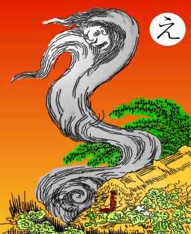 読み札 煙々羅 煙の妖怪 妖怪名 えんえんら 煙とか炎というのはじっと見ていると人間の顔や形に見えてくるものです。幽霊の正体みたり枯れ尾花というわけで、これはお化けの原点ですね。「羅」というのは布きれのことですが、魔王のことを「魔羅」と言ったりすると関係がありそうです。 |