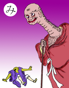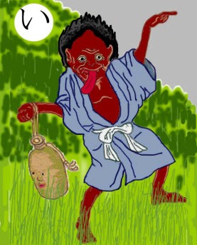 〈読み札〉 「ひでり神 手一つ足一つで風よりも速い」 〈妖怪名〉 「ひでり神」 〈解説〉「ひでりの時は涙を流し、寒さの夏はおろおろ歩き」というのは、宮沢賢治の「雨にも負けず」の一節。ひでりになると、作物が稔らず飢え死にする人が出る。それがつい70年とか80年くらい前の日本の現実だ。まだ100年と経っていないのだ。そうしてまた日本以外では今も現実だ。ひでりにはひでり神、どんな現象にもそれを司る神がいる。というのが、我々の祖先の思考だ。では、今の地球温暖化は何物の仕業なのか。こいつの仕業なのか。どうやったらこいつをつかまえられるのか。 |