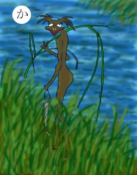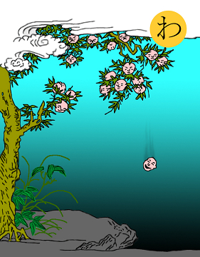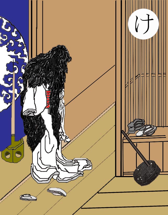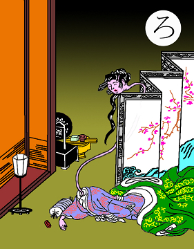 読み札 酒に酔った風流士が女郎屋の二階へ上がってなじみの女を訪ねる 途中、ひどく髪の長い女がうつむいている。その人かと思って 顔をのぞくと額も顔も全面髪の毛におおわれている。おどろいて 気を失ってしまったという。 うちのWifeは汗かきでいつも顔じゅう汗をた らたら滝のように流しているので「滝じょうろう」と名づけたら、えらい機嫌をわるくして、 仕返しに私のことを「おかっぱ」呼ばわりする。何のことかわかりませんよね。まったく。 |