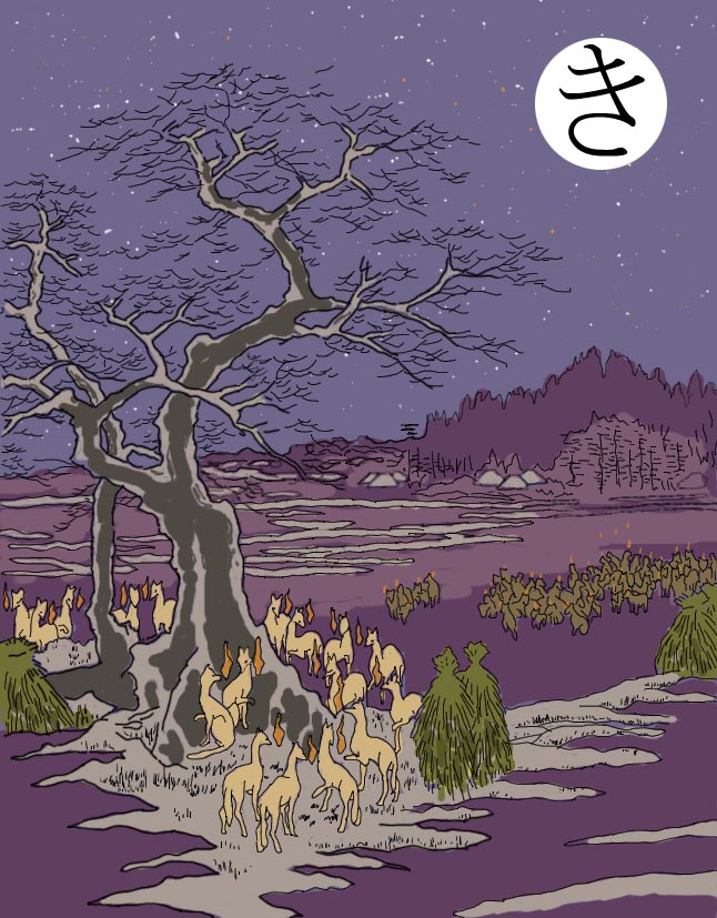 読み札 狐火大集合 大晦日の王子稲荷 妖怪名 狐火(きつねび) 狐の吐く息が光るといわれている。 狐の姿は見えず、怪しい光だけが辺 り一面に見えたりする。大晦日には 王子稲荷のあたりにこの怪火が集合 した。王子稲荷の狐はは関八州の狐 の頭領だという。 |