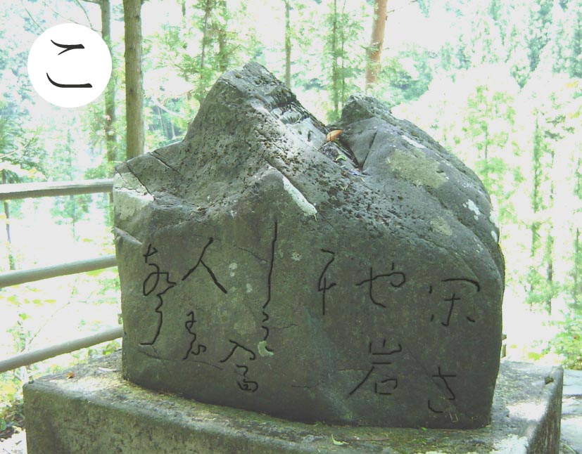 読み札 岡山県御津郡円城村にあった巨石で、夜分そこを通る とこそこそと話し声が聞こえたという。この写真の岩にはかの有名な芭蕉の句が彫ら れているのだが、ある時から、どうもこの岩の近くを通ると妙な声が聞こ えてくるという噂が立った。よくよく調べてみると「閑さや岩にしみ入る蝉の声」の「蝉」 の字が「人」になっている。 |