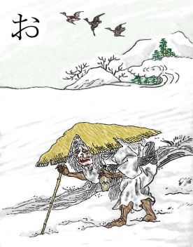 〈読み札〉 「目一つの化け物 山父」 〈妖怪名〉 「山父」(やまちち) 〈解説〉 「土佐おばけ草子」に出てくる妖怪。峠で新兵衛がこの妖怪に塩を奪われ、その馬まで食べられてしまったという。その絵の横に百人一首のパロディーが載っているのが面白い。 「山里は冬ぞさびしさまさりける 一ト目も出たり くさは枯れたり」 なぜ、人には目が二つあるのか。なぜ妖怪には一つ目が多いのか。そういうことを考えるのも面白い。 |