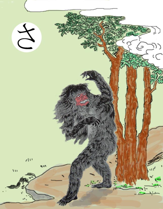 読み札 覚(さとり)はよく人の心を読む 妖怪名 「さとり」 〈解説〉 山奥に棲む妖怪で、木こりなどがたまに出会ったりすると、人の心を読んで先回りして話しかけてくる。 「今お前は俺のことを怖がっているだろう」「今お前はどうやって逃げようかと考えているだろう」とか図星を指されるので動けなくなってしまう。 仕方がないので何も考えないようにして木を伐っていたら、偶然木の切りカスが妖怪サトリに当たって、「おお、こいつは読めない」と言って逃げていったという話が残っている。 絵を見ると明らかに猿だ。大きな賢い猿が妖怪とされたのだろう。 |