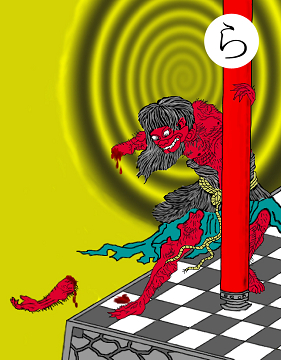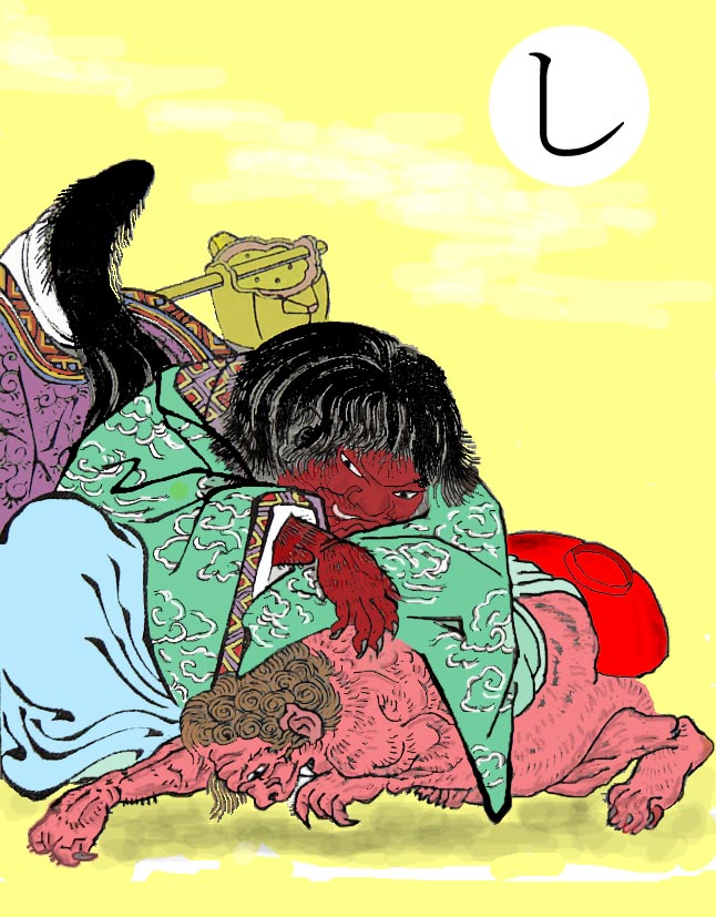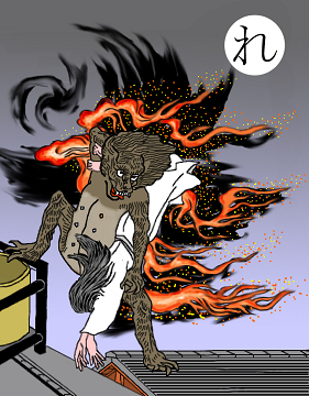〈読み札〉 「羅生門の鬼 渡辺綱に腕を切られる」 〈妖怪名〉 「羅生門の鬼」(らしょうもんのおに) 〈解説〉平安京の入り口にある壮大な羅生門。災いがうち続き、都は荒れ果て、いつしかここに鬼が棲みつくようになった。そいつを退治しようとやってきたのが渡辺の綱。土蜘蛛退治の源の頼光の筆頭家来である。腕を切られた鬼は後に腕を取り返しに来る物語が伝えられている。芥川龍之介の「羅生門」には、狐狸が棲んだり、盗人が棲んだりして、しまいには引き取り手のない死人を門に捨てていく習慣ができたと書かれている。 |