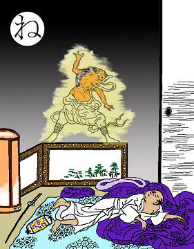 〈読み札〉 「寝る前と逆にあったら 枕返し」 〈妖怪名〉 「枕返し」(まくらがえし) 〈解説〉 朝起きたときに、枕が足元に転がっているときがある。これをふつうは寝相が悪いというのだが、実は枕返しという妖怪の仕業だというのだから驚きだ。眠りというは本当に不思議な現象で、幼い頃、眠りとは死と同じではないかと思い、怖くなって不眠症になった経験のある私としては、何となくよくわかる。この枕は眠りの象徴であり、枕が離れるともうこっちの世界に戻ってこられないのではないかという恐れが生んだ妖怪だろう。 |