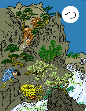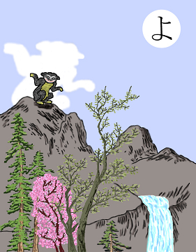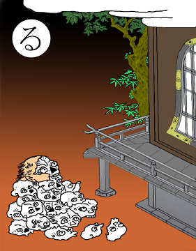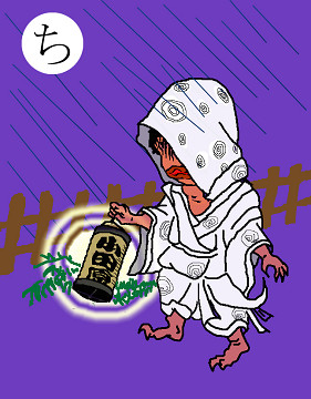 〈読み札〉 「土蜘蛛退治は源の頼光」 〈妖怪名〉 「土蜘蛛」(つちぐも) 〈解説〉 土蜘蛛という大きな蜘蛛が山中に棲んでいて悪さをしていたので、源の頼光が退治したという話がある。この妖怪の腹の中から1990個のドクロが出てきたという。 |