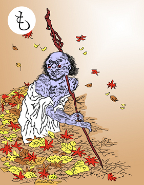 〈読み札〉 「モモンガ来るぞ 泣くんじゃない」 〈妖怪名〉 「ももん爺」(ももんじい) 〈解説〉モモンガというのは、お化けの代名詞である。子どもが聞き分けがないと、「お化けがきて、山に連れていっちゃうぞ」と脅したのだ。モモンガというのは、ムササビという動物の別名でもあり、木から木へ滑空する。山中で、そのムササビが顔にベタッと張り付いたら怖いだろうなという想像力が生んだ妖怪だ。そして、そのムササビ(モモンガ)が町へ出てくるときには、この絵のような爺さんの恰好をしている。杖がかっこいい。美しい紅葉の落ち葉の海を渡ってくるのも絵になる。 |