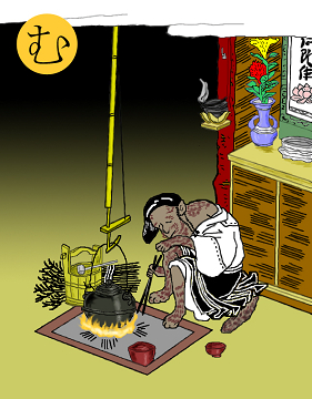 〈読み札〉 「狢(むじな)狸(たぬき)は人に化ける」 〈妖怪名〉 「むじな」 〈解説〉 「同じ穴のむじな」ということわざがあるが、むじなとたぬきは違うという認識があった。だからこそ、同じ穴のむじなということわざができたのである。「たぬきと同じ穴に棲むむじな」という意味である。こいつも狸と同じで人に化けるというわけである。この絵の解説には、「ある辻堂に歳をとったムジナが僧に化けてお勤めを怠らなかったが、食後についうっかりうたた寝をしてしまい、尾を出してばれてしまった」とある。人を化かすといってもお坊さんに化けてお勤めしているというのはそれはどういうことなのか。 |