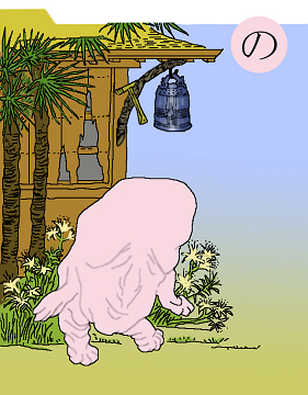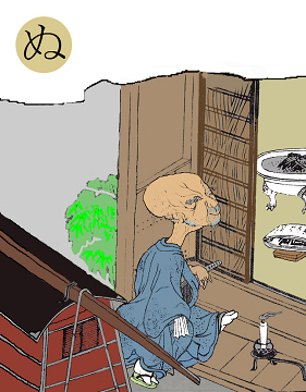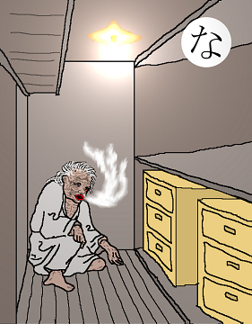 〈読み札〉 「納戸には納戸婆」 〈妖怪名〉 「納戸婆」(なんどばば) 〈解説〉 倉には「倉ぼっこ」がいて、便所には「便所神」、座敷には「座敷わらし」、そういうわけで、納戸にはこの「納戸婆」がいるわけです。何をしているかって、そんな野暮なことを聞いてはいけません。妖怪というのは、ただそこにいるということに意味があるのですから。強いて言えばそこを守っているのですね。何かを作れば必ずそこに魂が宿る。その魂の権化が彼らたちです。だから、勝手気ままに使うことはできないのです。きれいに掃除して大事に使わないと魂が逃げていくのです。 |