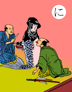 〈読み札〉 「人魚の肉は 不老長寿」 〈妖怪名〉 「人魚」(にんぎょ) 〈解説〉 人魚の肉を食べると不老長寿になるというのは日本だけらしい。また、人魚は女と決まっていて、男の人魚はとんと見ない。人魚はエロティックな想像とセットなのだ。だから、遂にはこの絵のように、「人魚一舐め一両一分」という商売にもなってしまった。人魚に体を売らせて男はヒモのような生活をしている。 |