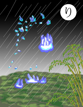 〈読み札〉 「燐火 鬼火(おにび) 人の精気を吸う」 〈妖怪名〉 「燐火」(りんか) 〈解説〉古来、人魂とか鬼火とかさまざまな怪しい火が目撃されている。私の祖父もある晩、墓地を通ったら人魂が飛んでいるのを見たといって、楽しそうに話してくれた。全然怖そうではなかった。年をとると、どんなことにも動じなくなるのだなと感心したことを今でも覚えている。祖父は早くに亡くなったので思い出は少ない。私をだっこするとヒゲをわざとゴリゴリほっぺに押しつけてくるので嫌だったこと、祖父が入った後の風呂は土がざらざらに残っていて嫌だったこと、など嫌なことばかりだが、素朴で不器用な人柄がしのばれる。 |
