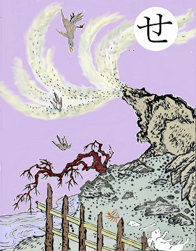 読み札 「殺生石(せっしょうせき)は飛ぶ鳥落とす」 妖怪名 「殺生石」(せっしょうせき) 〈解説〉 栃木県那須野にあったという石。妖怪九尾の狐が退治されてこの石にされてしまったという。石にされても毒気を周囲に放っていて、近くを通る鳥獣はその毒気にあたってみな死ぬのだという。 |