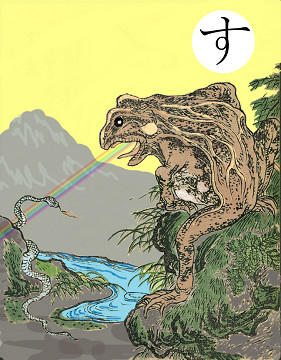 読み札 「周防(すおう)の大蝦蟇(おおがま) 虹のごとき気を吐く」 妖怪名 「周防の大蝦蟇」(すおうのおおがま) 〈解説〉 周防の国(今の山口県)の山奥に八尺(約2m半)の大きなガマガエルが棲んでいたという。 蛇ににらまれた蛙ということわざがあるが、このガマは好んで蛇を食べるという。また、虹のような気を吐くと虫たちがみなガマの口に餌として吸い込まれてしまう。 |