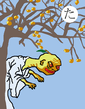 読み札 「たんころりん 柿の実取らぬと化けて出る」 妖怪名 「たんころりん」 〈解説〉 私の大好きな妖怪の一つ。柿の実をいつまでも取らずに置いておくと、この妖怪が出てきて、無言で懐から柿の実をぼろぼろこぼして行くという。ただそれだけ。ただ己の存在だけを誇示して消えていく。「油すまし」にも通じる。とにかくしゃべらないのがいいね。 |