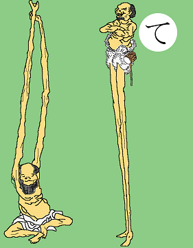 〈読み札〉 「手長足長 伝説の巨人」 〈妖怪名〉 「手長足長」(てながあしなが) 〈解説〉 鳥海山にいたという伝説があったり、中国に伝説があったりする。二人セットで出てくることが多い。「枕草子」には清涼殿の隅にこの手長足長を描いた屏風があったという記事があり、みな女房たちが気持ち悪がって遠くから眺めていたという。 この絵は北斎の漫画からとりました。 |
