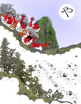 〈読み札〉 「山の怪 天狗礫(つぶて)に 天狗笑い」 〈妖怪名〉 「天狗」(てんぐ) 〈解説〉山という場所は本当に不思議な場所だ。現実とは別の異空間だ。風も生きているのが実感される。音がしなくなる瞬間もある。そういうときものすごい不安に襲われる。かと思うと、木のこすれる音も何かの会話に聞こえてくる。突然どこからか笑い声が聞こえてくることもある。どこか遠くの声が風に乗ってくるのかもしれないが、それは天狗が笑っているようにも思える。どこからか、石ころがとんでくることがる。それは単に重力によって崖が崩れただけかもしれないが、天狗がいたずらして投げつけてきているようにも思えるのだ。 |