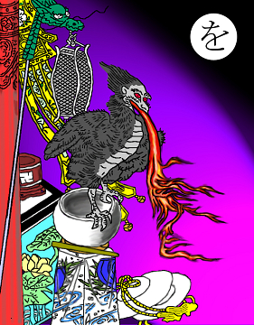 〈読み札〉 「陰摩羅鬼 屍(しかばね)の気の変じた化け鳥(ばけちょう)」 〈妖怪名〉 「陰摩羅鬼(をんもらき)」 〈解説〉これも出現例の少ない妖怪。新しい仏さんがお寺に持ち込まれたりした時、その屍の気が変化してこの鳥の姿になるという。「気」というのは何でしょうか。生命力の別名でしょうか。死後は気も雲散霧消してしまうのでしょうが、死んだばかりの新しい死骸にはまだ気が残っていて、そいつが体から抜けるときにけっこう大きなエネルギーの塊になるのでしょう。それがこの鳥のように見えるのでしょう。別に悪さはしないようです。 |