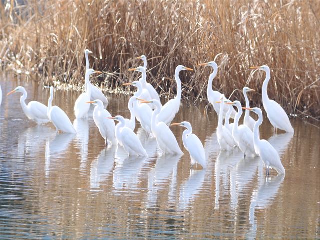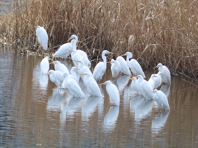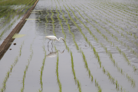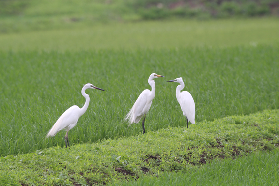 シラサギ三者会談。田んぼでは主におたまじゃくしをついばんでいた。
