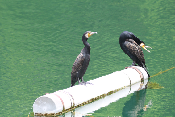 カワウくんとカワウさん。たぶん夫婦。よく見ると、右側の鳥の羽に針と糸がついている。釣り人の残したものがからまったか。