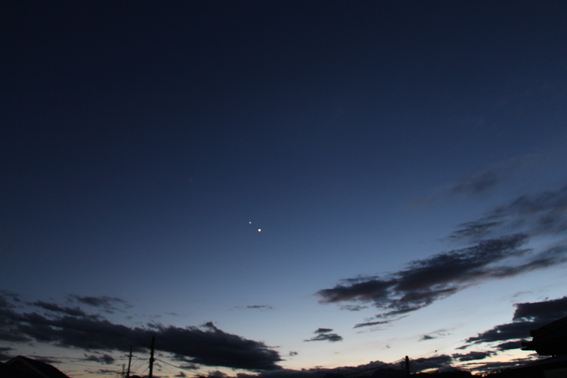 鳥撮りのついでに梅雨空の夕方の西の空に金星と木星のランデブー。